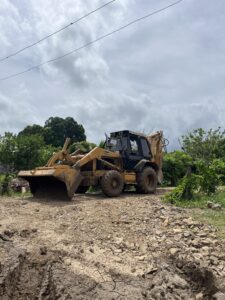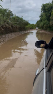 Ein paar Kilometer weiter standen wir dann aber schon wieder… dieses Mal wegen eines riesigen Wasserlochs in der Straße. Ein Radlader versuchte, das Loch mit Kies und Sand zu füllen, aber nach ca. 15 Minuten Warten schickten uns die Bauarbeiter mit den Worten zurück: Umdrehen und einen anderen Weg nehmen.