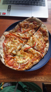 Zurück im Hostel machte ich eine Runde Pilates. Zum Mittagessen wurden heute Pizzenim Steinofen gemacht. Klang erstmal gut, war aber leider ziemlich schlecht organisiert. Wir bekamen unsere Pizzen total zeitversetzt – ich z. B. fast eine Stunde nach Lynn, was schade war, weil wir nicht wirklich zusammen essen konnten. Die Pizza an sich war aber super lecker.
