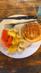 Heute stand für mich die Schnorcheltour rund um die Isla Coiba an. Wie die Tage zuvor gab’s heute wieder Pancakes mit Obst.