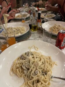 Dort trafen wir noch weitere Deutsche und beschlossen alle zusammen essen zu gehen. Es ging zu einem Italiener direkt am Strand. Ich bestellte eine Art Veggie-Carbonara mit Pilzen. Das Essen ließ zwar auf sich warten, aber wir nutzten die Zeit zum Quatschen. Eine von den Mädels kam sogar aus Karlsruhe – die Welt ist wirklich klein.