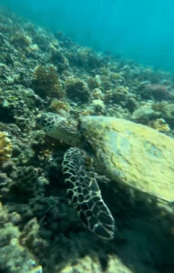 An der ersten Inseln angekommen, hielten wir mehrfach zum Schnorcheln. Unser Guide schwamm voraus und zeigte uns unterwegs die Meereswelt. Gleich zu Beginn sahen wir Haie (zum Glück nur die „kleinen“ Riffhaie) und direkt danach Schildkröten. Ich merkte schnell, dass ich nicht besonders tief tauchen kann, da mir der Druck in den Ohren ziemlich zu schaffen machte. Zum Glück tauchte unser Guide immer wieder mit meiner GoPro ab und filmte für uns die Tiere unter Wasser.