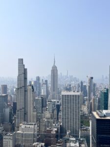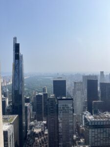 Angekommen im Rockefeller Center gings direkt los. Zu Beginn wurde ein kurzes Video über die Geschichte des Gebäudes gezeigt – unter anderem auch über das berühmte Foto der Bauarbeiter, die auf einem Stahlträger sitzend ihre Mittagspause machen. Anschließend fuhr ich mit dem Aufzug nach oben. Auf drei Etagen konnte man die Aussicht genießen.