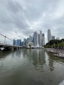 Gegen Mittag klarte es endlich auf und der Regen hörte auf. Ich machte mich zur Jubilee Bridge auf und spazierte am Singapore River entlang. Viele Leute hatten Plastikplanen wie Picknickdecken ausgebreitet und aßen dort gemeinsam zu Mittag. Ich setzte mich ans Wasser, legte eine Pause ein und aß auch etwas.