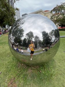 Im Park vor dem Rathaus stieß ich auf große spiegelnde Kugeln, war wohl Kunst. Viele machten dort Fotos – ich natürlich auch.