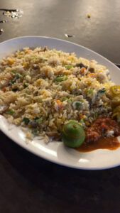 Zum Abendessen ging ich in den Bereich Satay by the Bay, wo es verschiedene Essensstände gab. Ich entschied mich für gebratenen Reis mit Gemüse. Geschmeckt hatte er zwar nicht besonders, aber satt wurde ich.