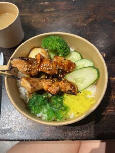 Ich bestellte mir eine Bowl mit Gemüse, Reis und Lachs – lecker und gar nicht teuer.
