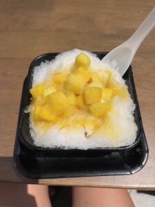 Zum Nachtisch gab es ein Mango-Eis aus abgeschabtem Eis, frischen Mangostückchen, Kokos und Mangosoße – mal etwas anderes, aber sehr erfrischend.