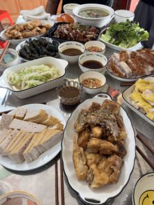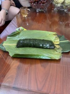 Der erste Halt war unser Hotel, wo wir kurz das Gepäck abstellten. Dann ging es direkt weiter zu Duc’s Oma. Dort wurden wir von vielen Verwandten unglaublich herzlich empfangen – alle freuten sich riesig über unseren Besuch. Zum Probieren bekamen wir eine Art Mochi (eine klebrige Reismasse) mit süßer Sesamfüllung. Die Konsistenz war zwar etwas gewöhnungsbedürftig, geschmeckt hat es aber sehr lecker.