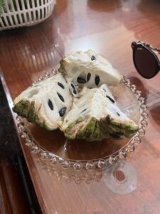 Außerdem sahen wir kleine Auberginen und viele weitere Pflanzen. Zurück im Haus gab es Obst, darunter Drachenfrucht und eine Frucht, die auf Deutsch „Zimtapfel“ heißt – die kannte ich bisher noch nicht. Trotz der vielen Kerne war sie unglaublich lecker.