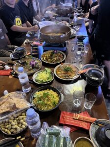 Im Restaurant erwartete uns ein üppig gedeckter Tisch. In der Mitte standen zwei große Töpfe mit heißer Suppe auf Kochplatten, außen herum viele verschiedene Beilagen: Fisch, Fleisch, Gemüse und mehr. Man konnte sich das Fleisch und Gemüse direkt in der Brühe garen – super lecker.