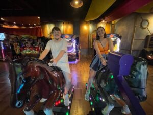 Danach probierten wir die Rodelbahn aus, die allerdings extra kostete. Leider war sie nicht so spektakulär wie erwartet und ziemlich schnell vorbei. Dafür landeten wir danach in einer großen Spielhalle, in der alle Attraktionen kostenlos waren: ein Free-Fall-Tower, verschiedene Automaten-Spiele, ein Tanzspiel, Autorennen – einfach alles.