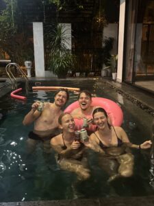 Am Abend entspannten wir alle noch gemeinsam im Pool, hörten Musik und quatschten. Um Mitternacht feierten wir in Laras Geburtstag hinein: Es gab Kuchen, wir sangen, hängten die Girlande auf und blieben noch bis fast 2 Uhr nachts im Pool.
