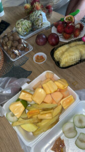 Am Nachmittag ging’s mit einem Grab zurück ins Airbnb. Dort bestellten wir uns alle Bowls – unser letztes gemeinsames Essen, bevor Lara und Mirjam zum Flughafen mussten. Wir probierten dann noch Obst, dass uns Duc`s Cousin mitgebracht hatte.