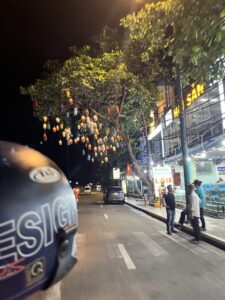 Zum Abendessen waren wir mit Ducs Tante und Onkel verabredet. Wir fuhren alle zusammen mit Rollern zu einem Restaurant. Unterwegs merkten Jonas und ich, dass unser Roller fast keinen Sprit mehr hatte, aber es war schwierig, das während der Fahrt mitzuteilen – Ducs Verwandte sprechen kaum Englisch und wir wollten nicht einfach anhalten, da wir den Weg nicht kannten.