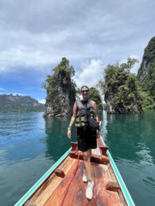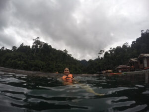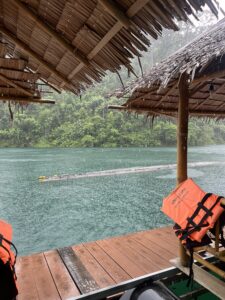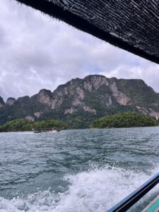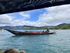 Die Fahrt war wunderschön – überall hohe Kalksteinfelsen, dichter Dschungel und türkisblaues Wasser. Uns wurde erzählt, dass der See künstlich gestaut wurde und an manchen Stellen bis zu 100 Meter tief ist.