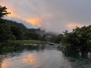 Nach etwa anderthalb Stunden ging die Sonne langsam unter und wir sind zurück zum Boot. Der Sonnenuntergang über dem See mit dem Nebel war wunderschön!