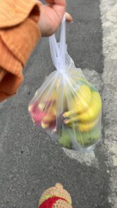 Auf dem Rückweg kam ich an einem Obstladen vorbei und kaufte eine Drachenfrucht, eine Mango und vier Bananen – zusammen für umgerechnet 1,55 €. So günstig!