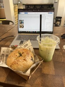 Ich nahm meinen Laptop mit und machte mich auf den Weg in ein Café in der Nähe. Dort bestellte ich mir einen Matcha und ein Brötchen, das ich für ein Schokobrötchen hielt – bis ich hineinbiss: Käse?! Aber lecker war’s trotzdem.