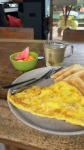Ich bin gegen 9:00 Uhr aufgewacht und habe sofort gemerkt, dass ich mich nicht ganz fit fühle. Deshalb blieb ich erst einmal ein bisschen im Bett liegen, bevor ich irgendwann aufstand, Zähne putzte, mich umzog und mich mit meinem Laptop nach draußen setzte. Ich machte mir einen Tee und bestellte mir beim Hostel-Frühstück ein Omelette mit Toast. Besonders cool war, dass es kostenlos frische Früchte gab – Papaya, Ananas und Melone.
