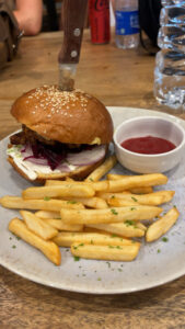 Ich duschte, um das ganze Massageöl abzuwaschen, chillte noch etwas im Bett und ging dann mit Leoni runter zum Abendessen. Wir saßen mit einigen anderen aus dem Hostel zusammen. Ich gönnte mir einen Veggie-Burger mit Pommes und unterhielt mich mit ein paar Leuten.