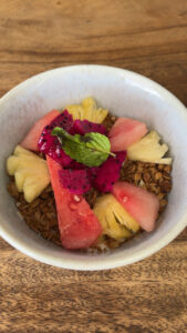 Heute Morgen klingelte der Wecker kurz vor 8 Uhr. Leoni und ich hatten uns gestern für eine Island-Tour auf Nusa Penida über unser Hostel angemeldet. Wir frühstückten dort – für mich gab es Joghurt mit Granola, Honig und Obst.