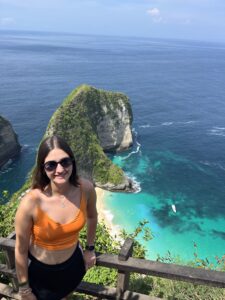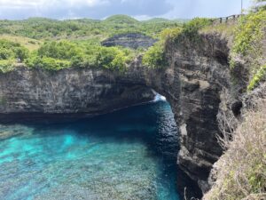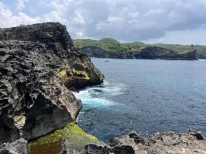 Um 9:15 Uhr ging es los. Wir wurden auf Autos aufgeteilt und fuhren etwa 45 Minuten über extrem holprige Straßen zum Kelingking Beach. Der Ausblick war wirklich beeindruckend, aber es war komplett überlaufen mit Touristen.